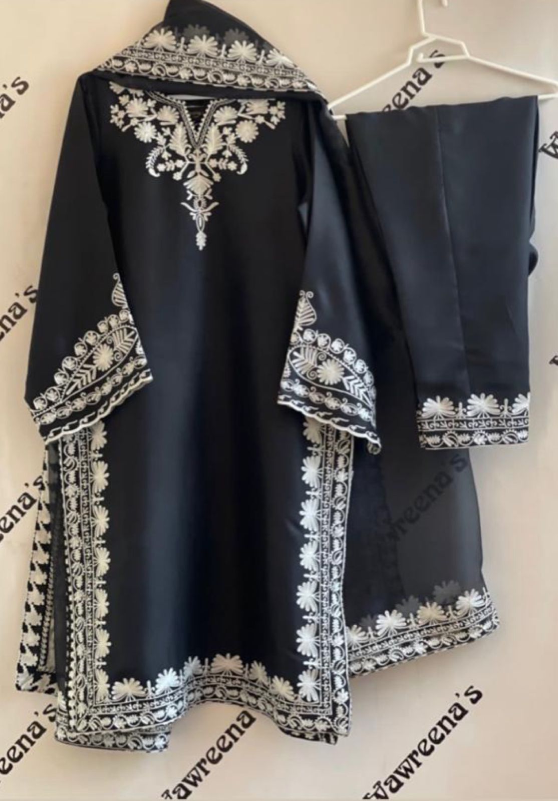 Product Details:-A pure chiffon embroidery three piece stitched in sizes small medium large xl and have a loaded embroidery which making its wedding collection đ