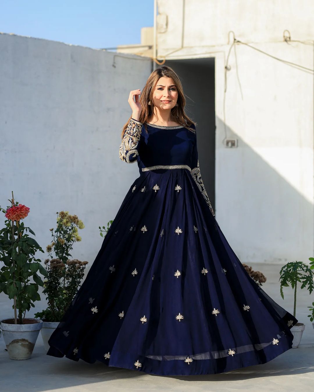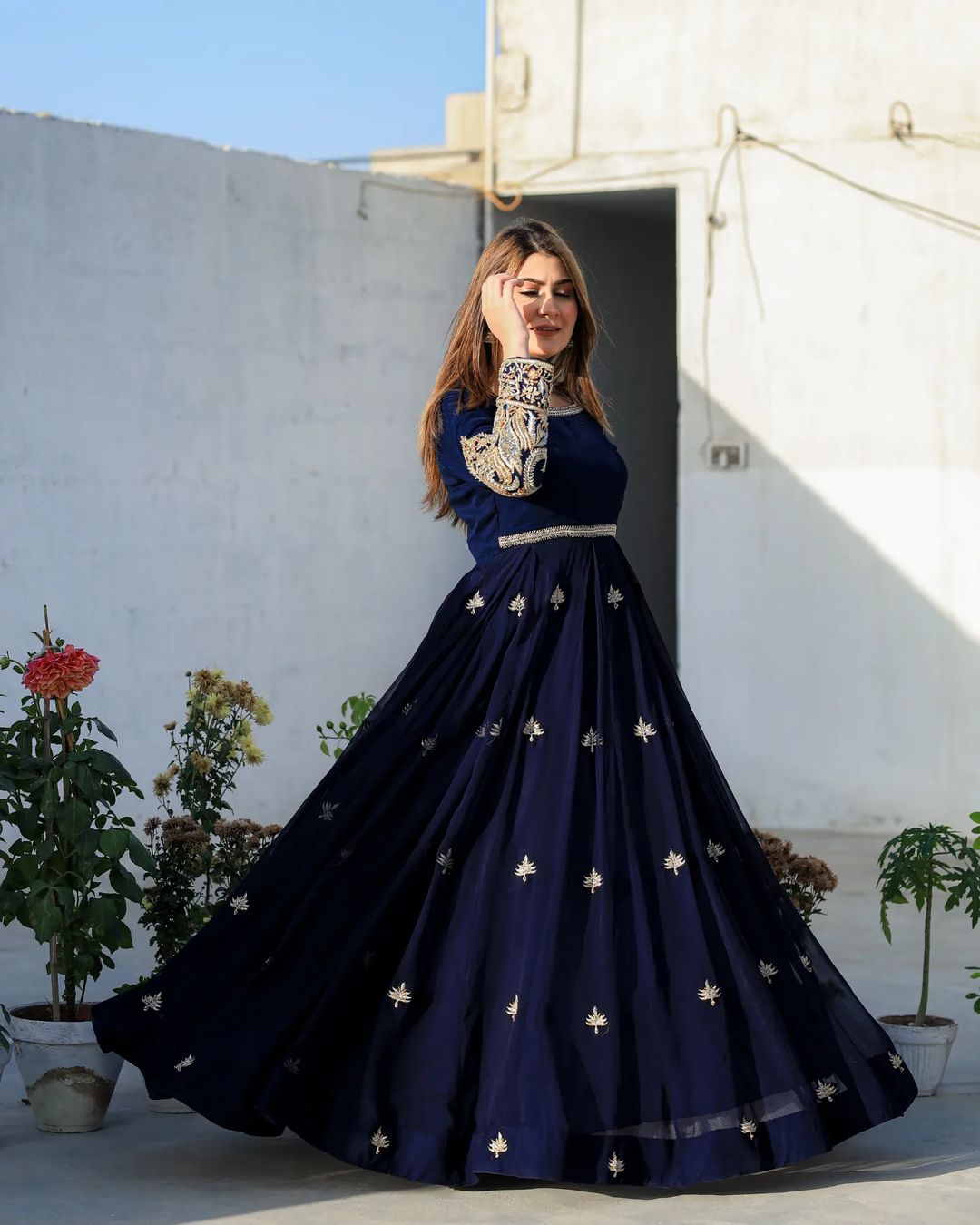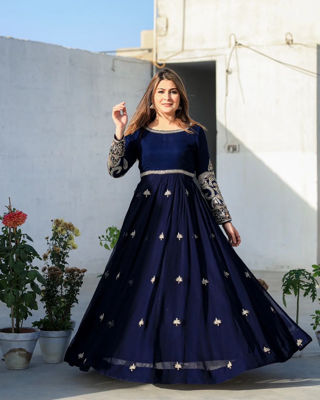 This product is a long, elegant chiffon maxi featuring intricate handwork embroidery and premium stitching. It's designed for weddings, offering a luxurious and stylish look with high-quality craftsmanship. Available in blue, this maxi is perfect for making a statement at special events.