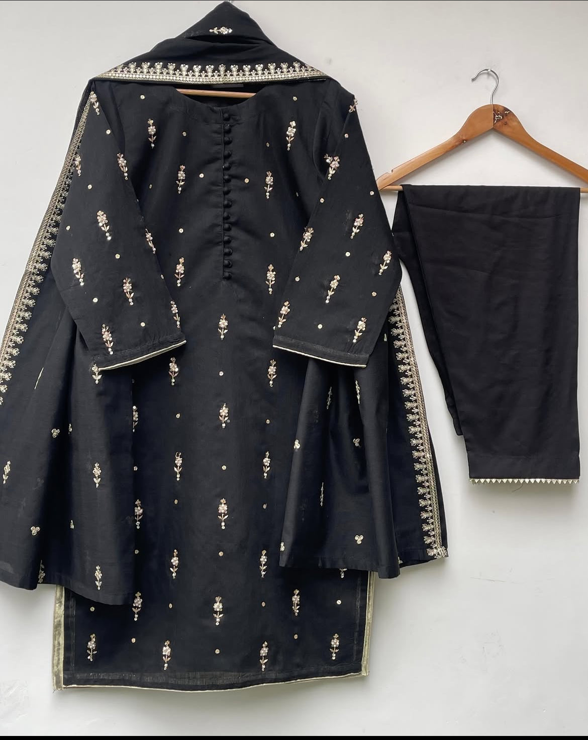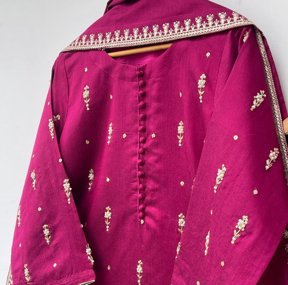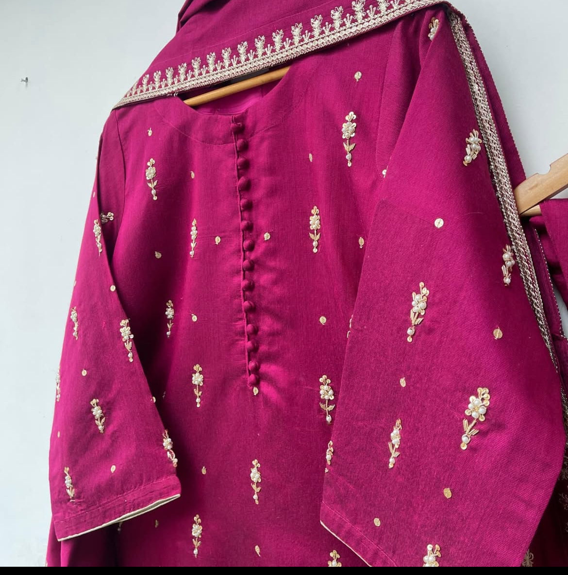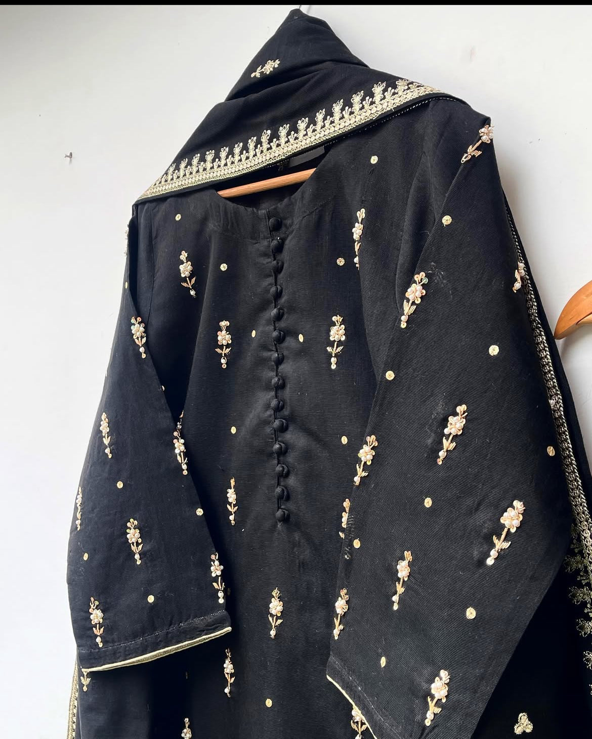 Product Details:- A purely Eid collection launched specially crafted in khadi loom net stuff with crepe trousers and khadi loom embroidered duppata giving a cozy look