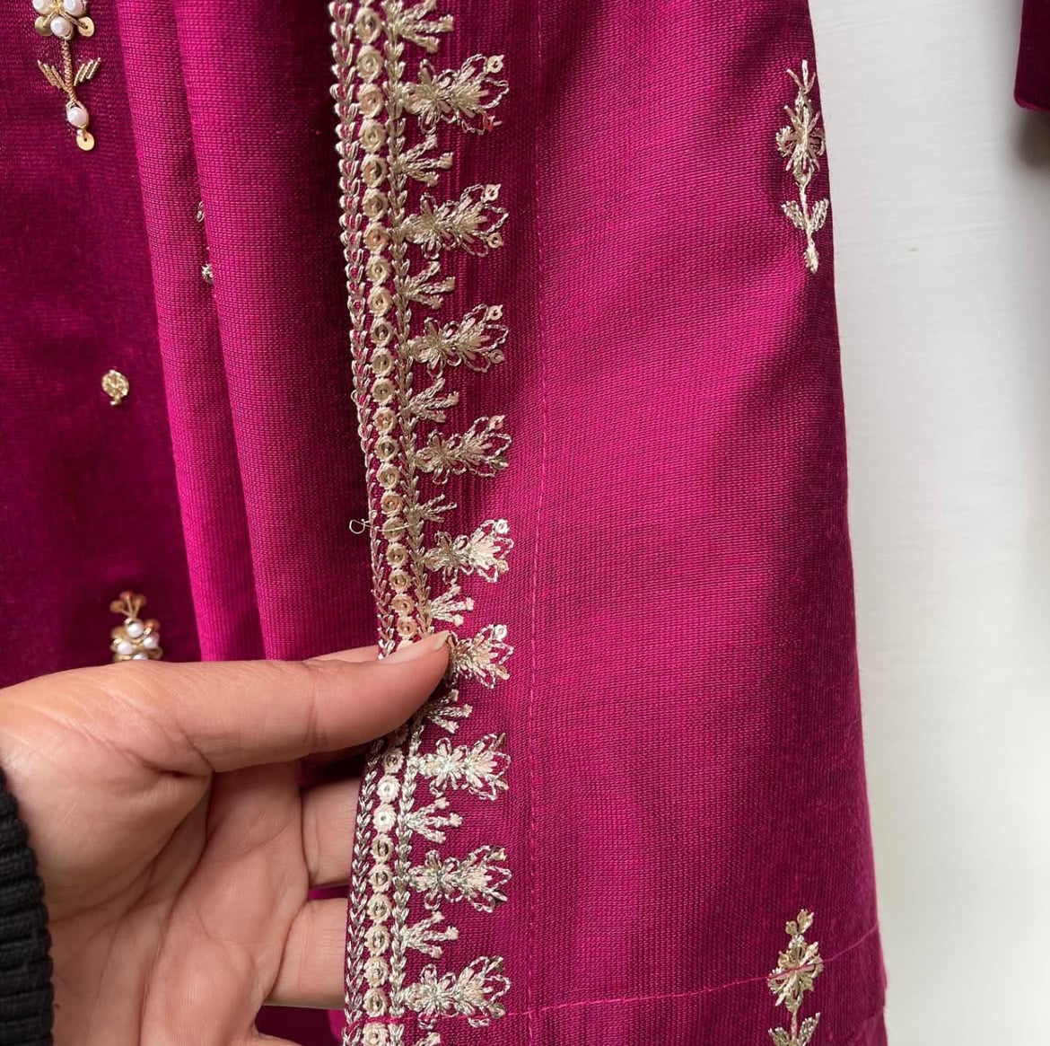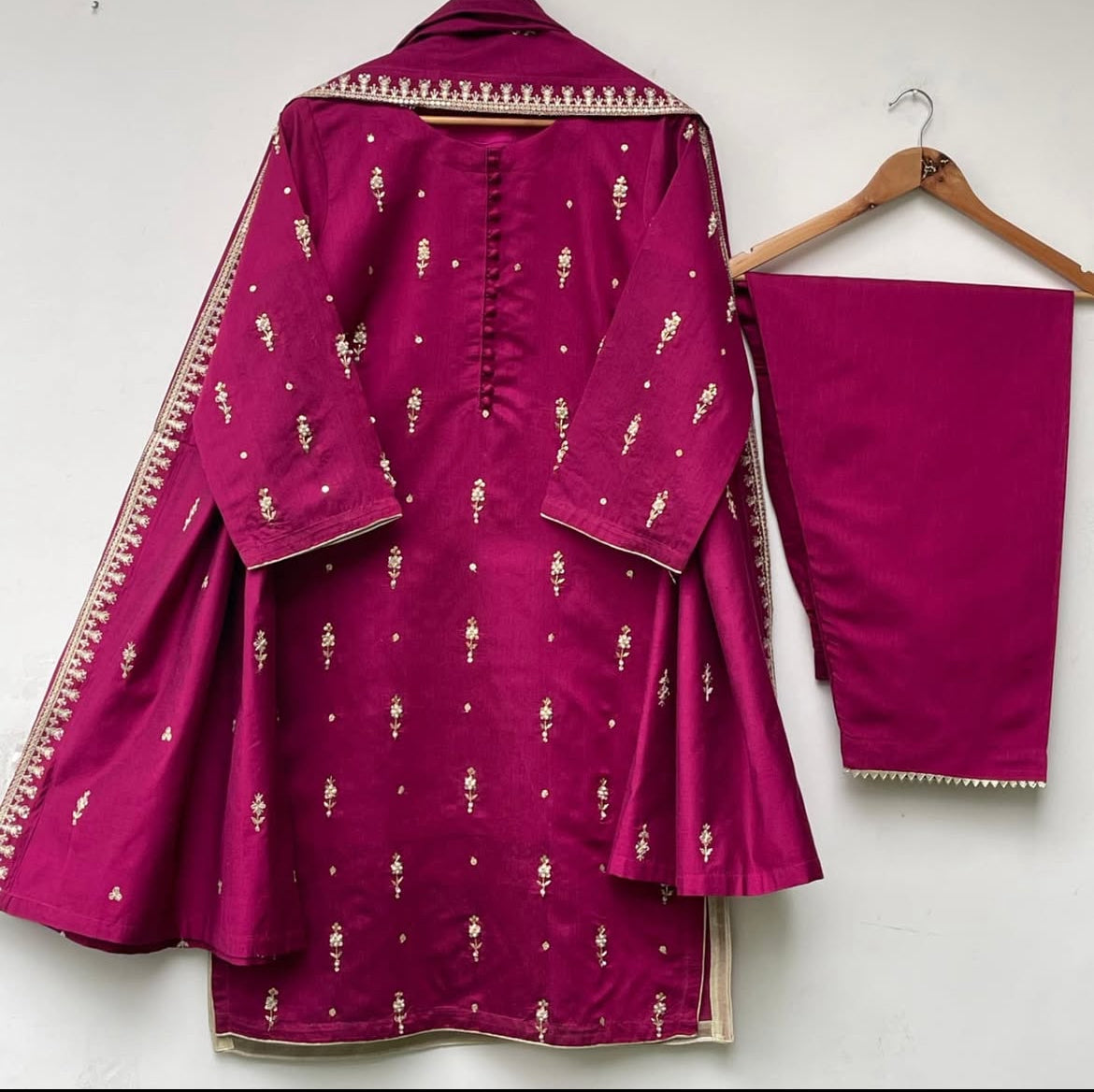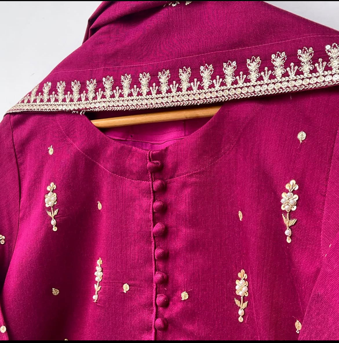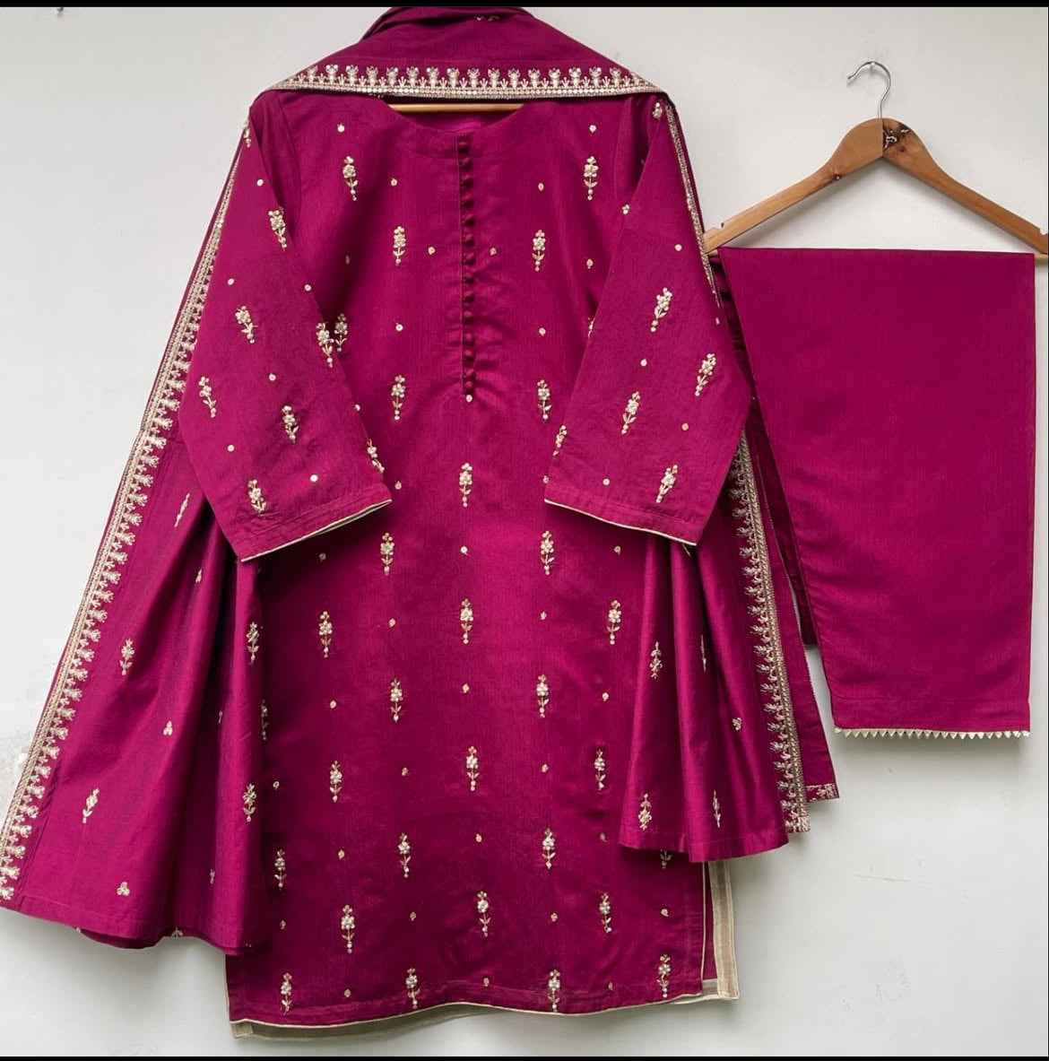 Product Details:- A purely Eid collection launched specially crafted in khadi loom net stuff with crepe trousers and khadi loom embroidered duppata giving a cozy look