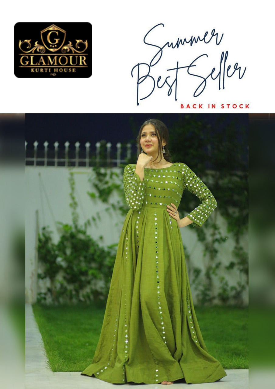 Exclusively available at Glamour Kurti House, this mirror-embellished maxi dress is perfect for weddings, festive celebrations, and evening parties.