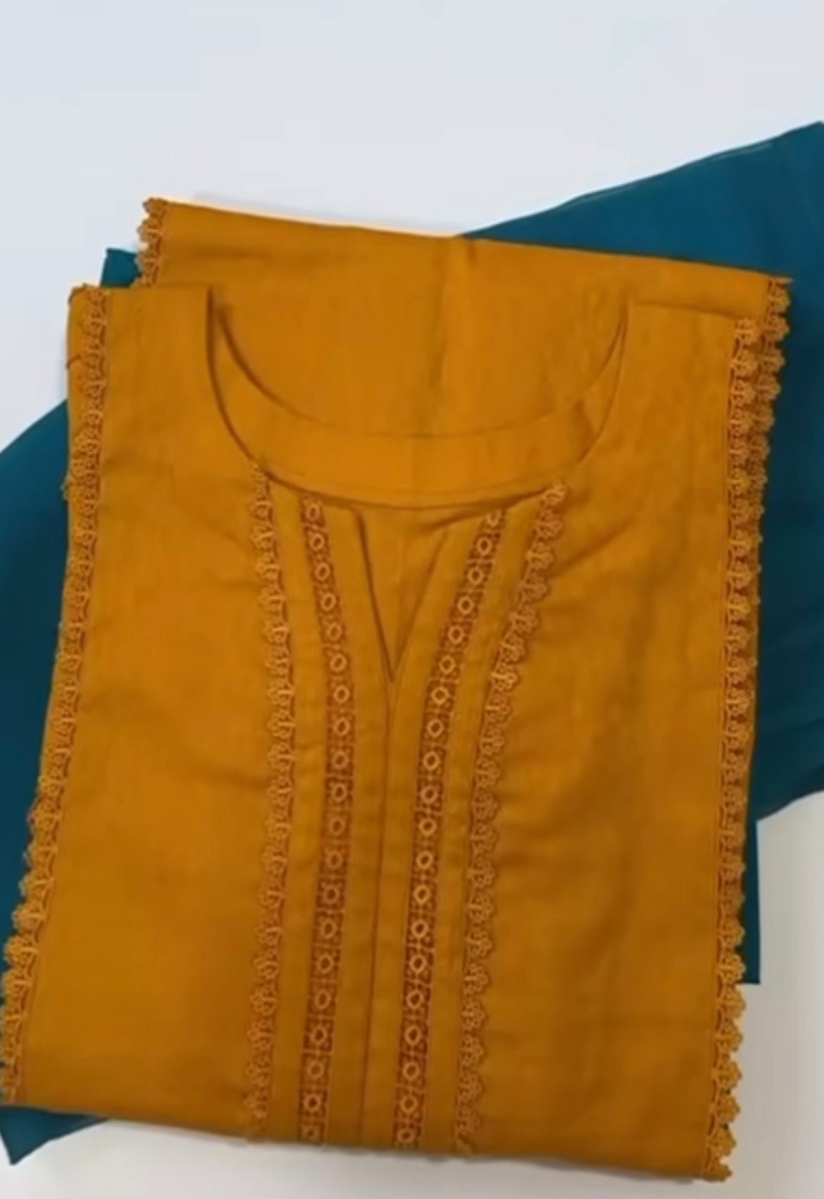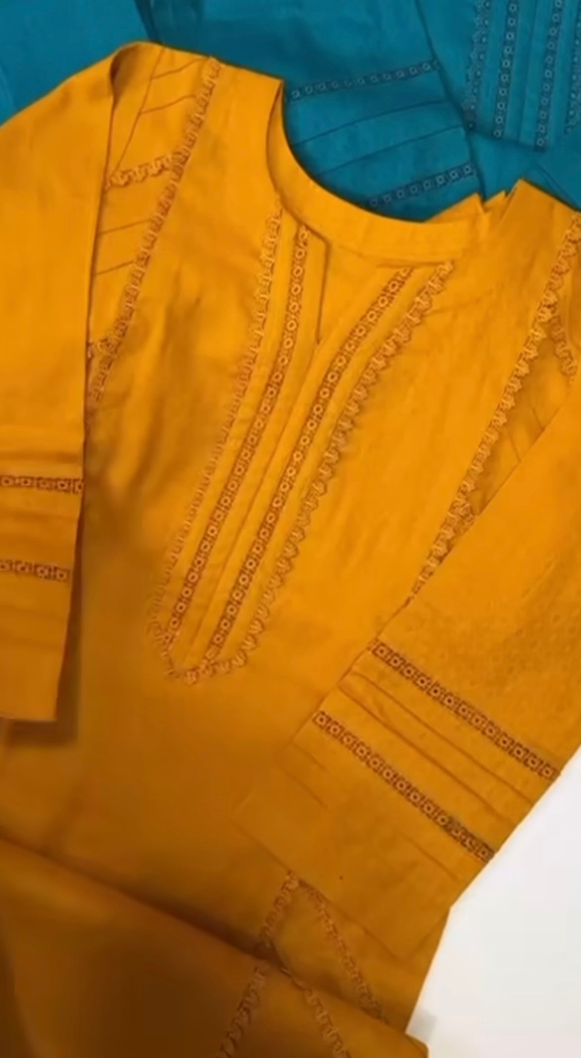 "Elegant ethnic kurta available in mustard and zinc colors, featuring intricate lace work detailing."