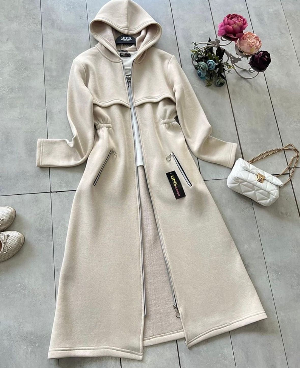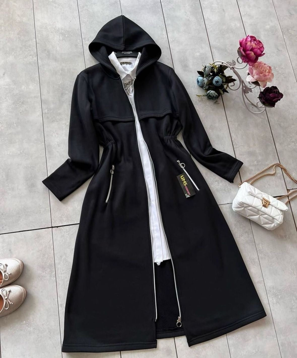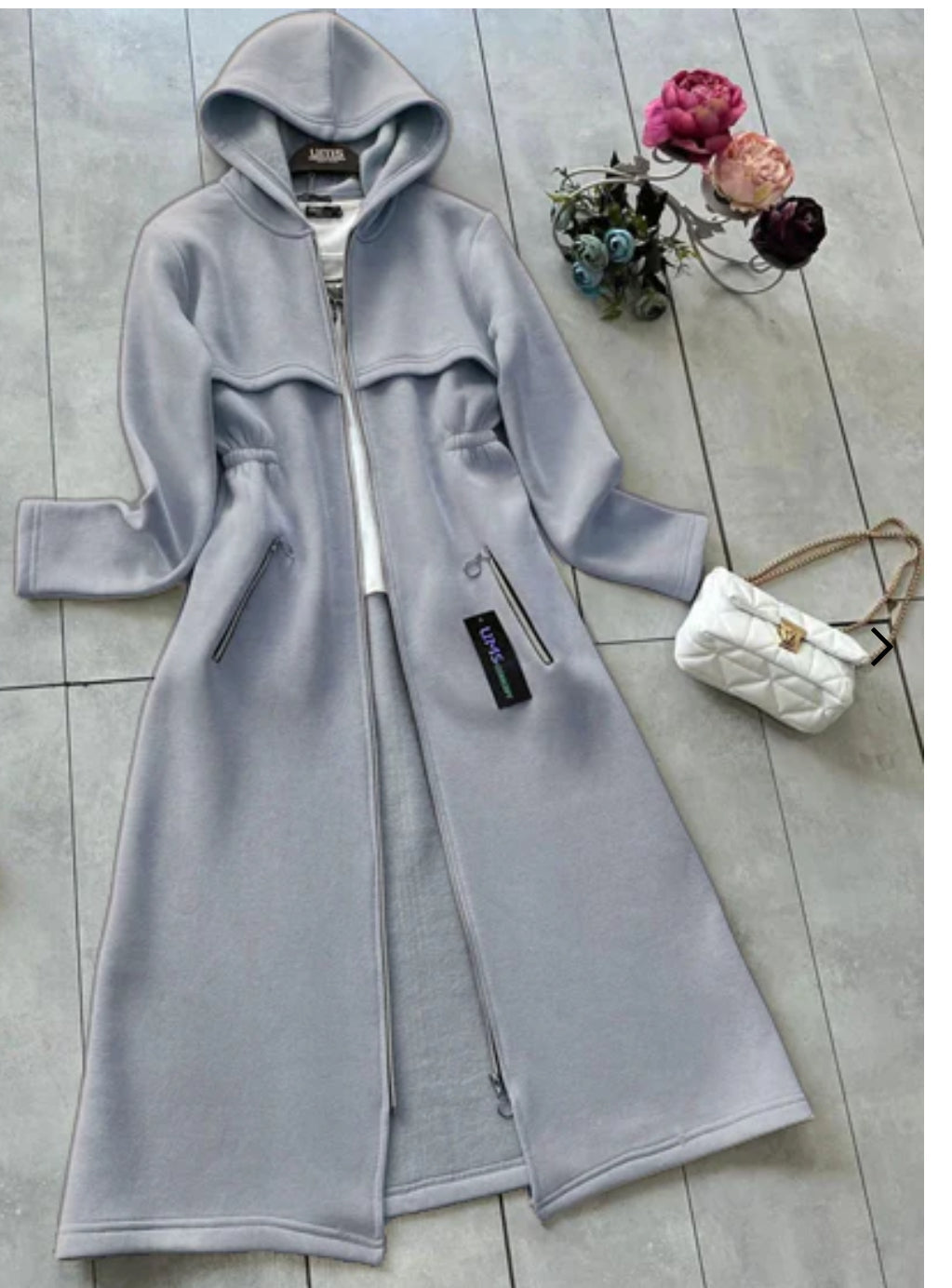 A Long hoodie zipper in warm chic double fleece with side pockets and very comfortable for your winter(lenght 46")