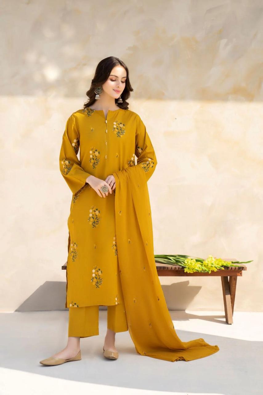 The highlight of this set is the beautifully embroidered mustard kurti dress. Made from premium lawn fabric, the long-length kameez is both stylish and comfortable. Its vibrant color and intricate floral embroidery make it a standout piece in any kurti collection. Whether you're shopping at kurti stores or browsing for a kurti sale in Pakistan, this is a piece you don't want to miss.
