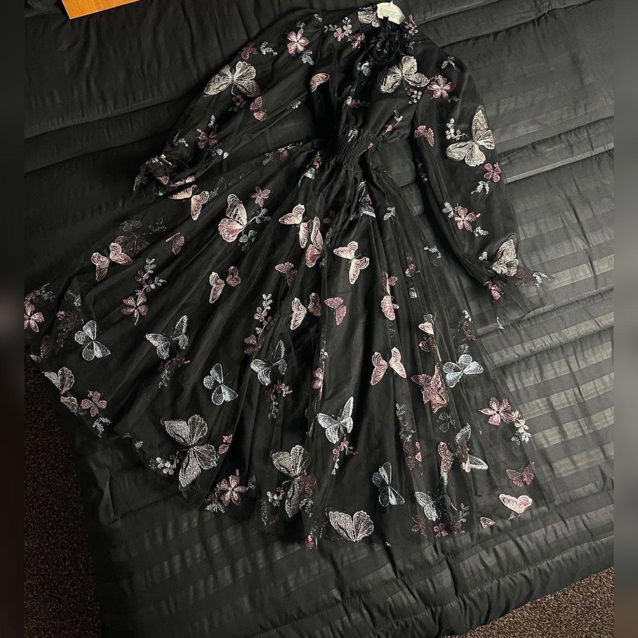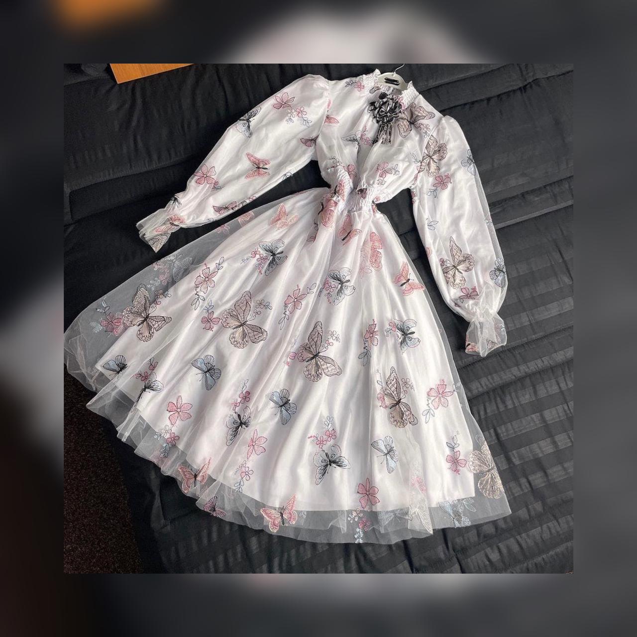 The standout feature of this frock is undoubtedly the stunning butterfly embroidery. Intricately woven across the fabric, the butterflies are delicately stitched, creating a design that’s both sophisticated and playful. The butterfly motif has long been a symbol of transformation and freedom, making it a perfect fit for women who embrace grace and elegance in all aspects of their lives. Whether you're attending a garden party, a birthday celebration, or even a casual lunch, this frock will elevate your look instantly.