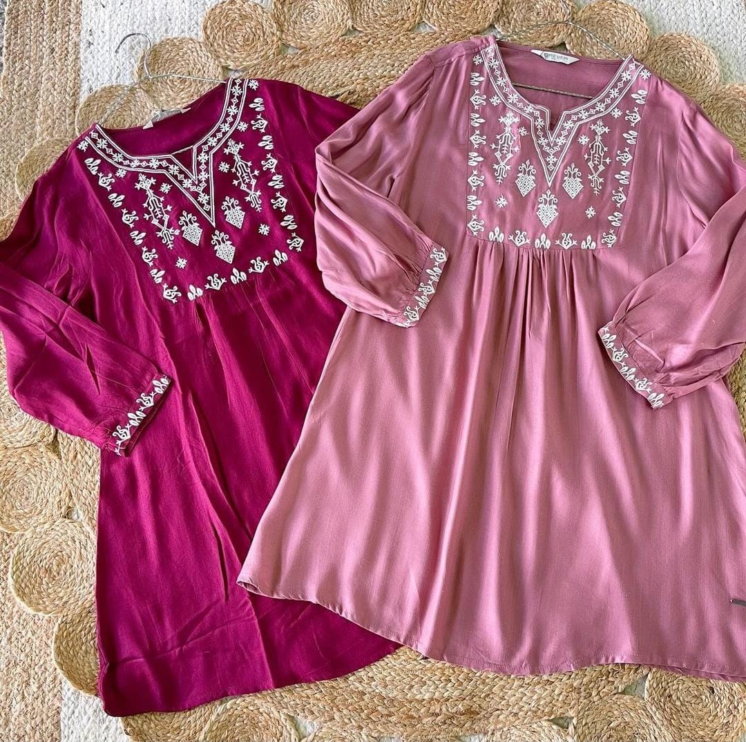 Available in four colors—Peach, Burgundy, White, and Black—this tunic dress features delicate white embroidery on the neckline, chest, and cuffs. Made from lightweight fabric, it offers a comfortable, flowy fit that’s perfect for any occasion, whether casual or dressed up. Add this versatile piece to your wardrobe for effortless style.