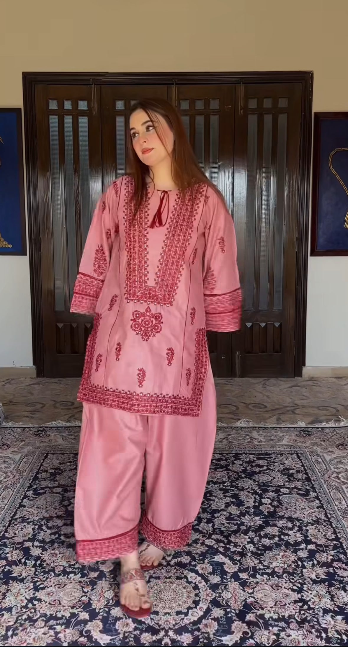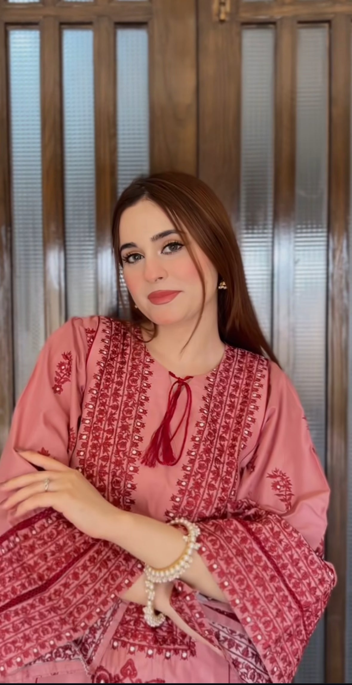 A summer friendly lawn cotton fully embroidered shirt with trendy shalwar look good combo of light and dark pink giving a vibrant look