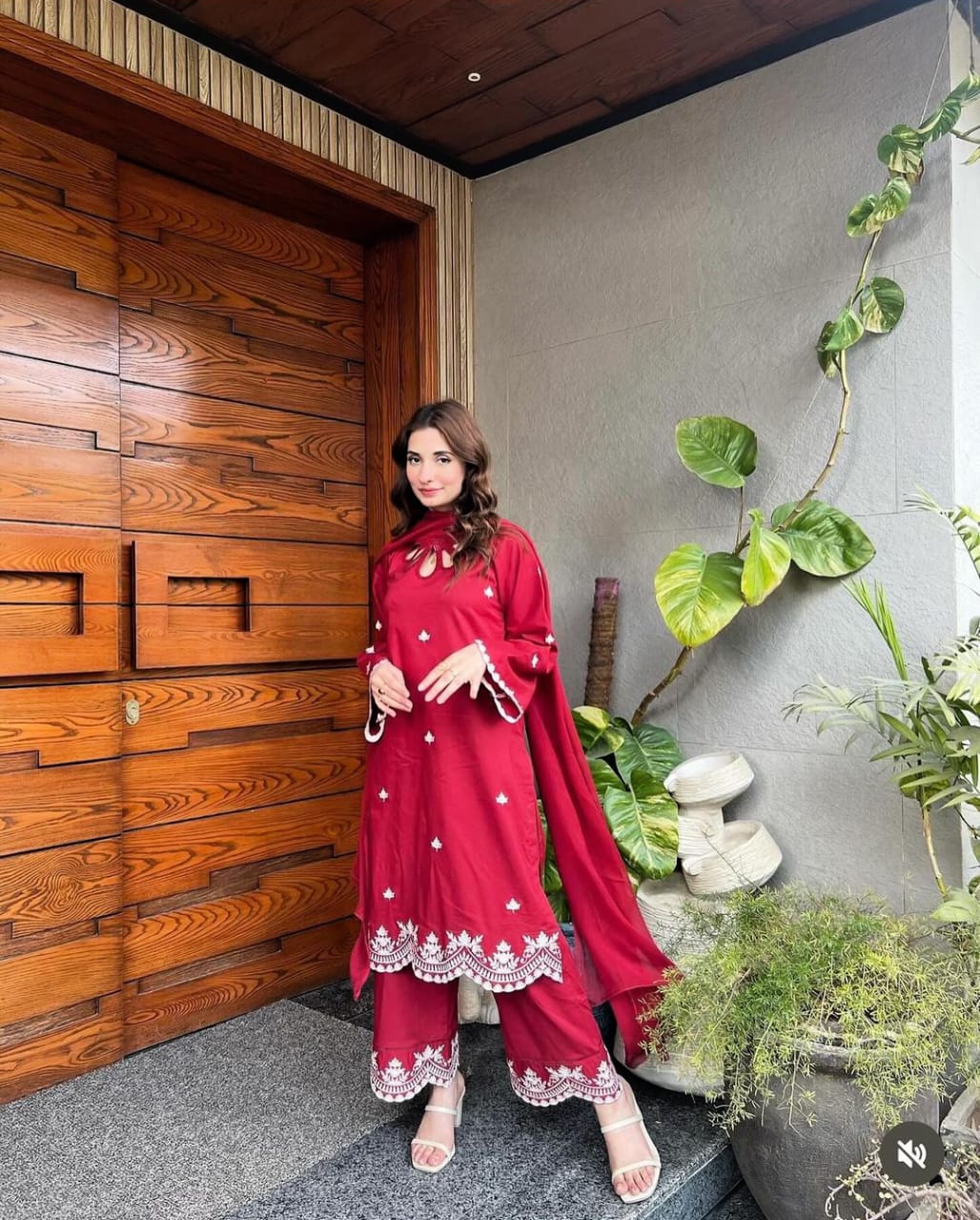 The Red Rose Three-Piece set is designed to make you feel like the best version of yourself—comfortable, chic, and elegant. The delicate floral embroidery on the fabric adds a feminine and sophisticated touch, making it perfect for weddings, festive occasions, or even a day out with friends. The deep red color offers a bold yet refined look, adding just the right amount of personality without being overpowering.
