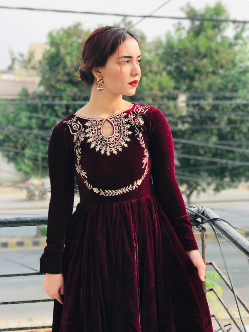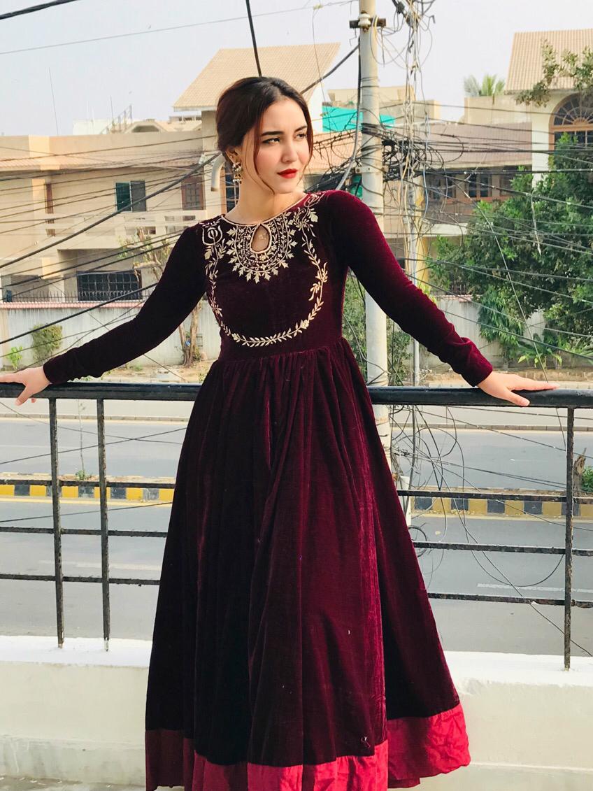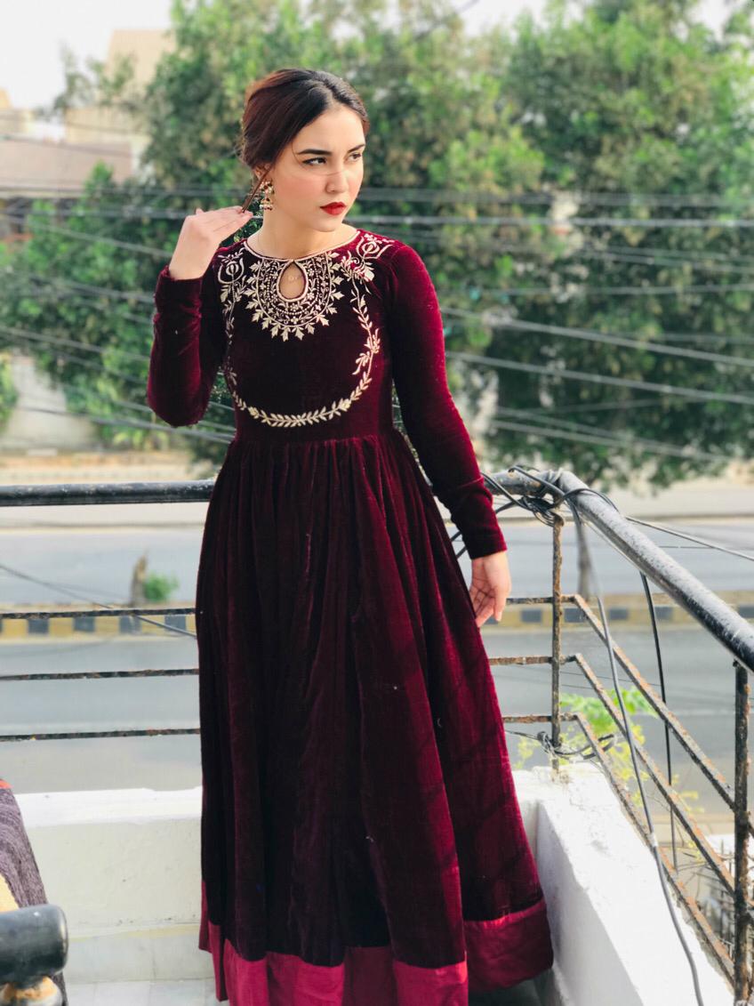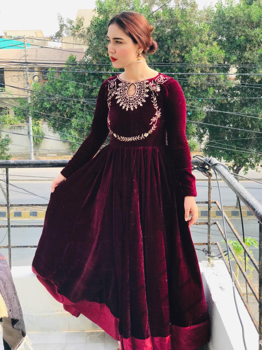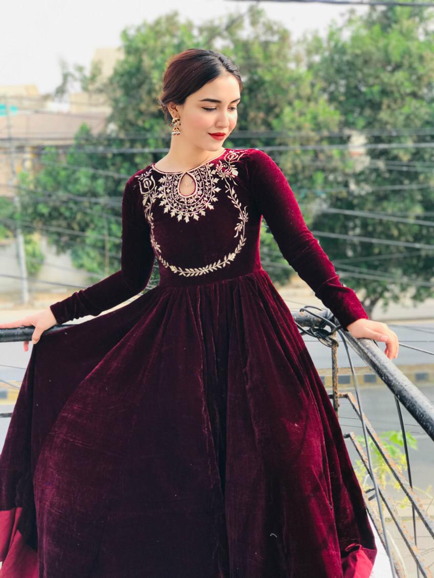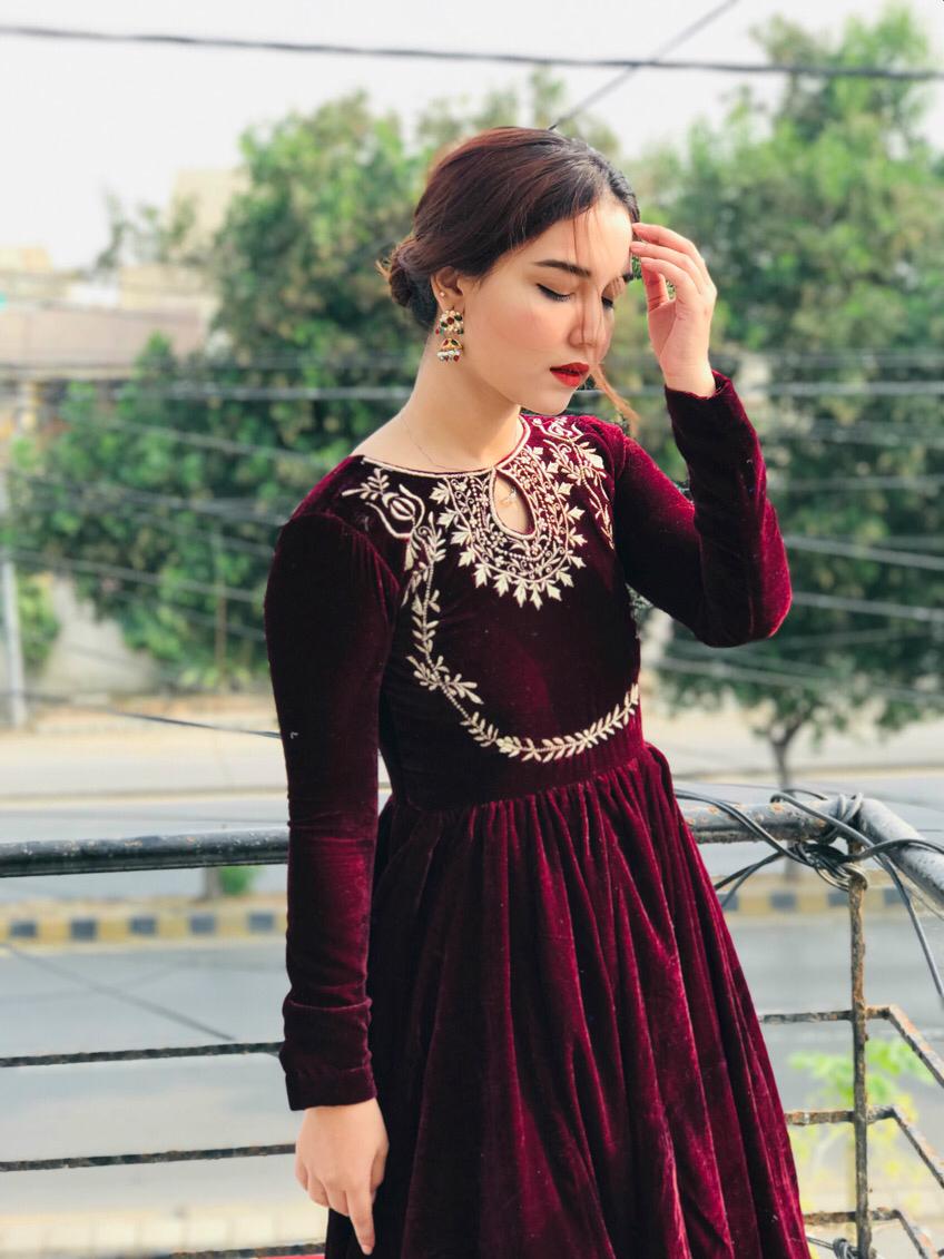- Product Details: A velvet premium quality frock with beautiful neck embroidery with heavy flair