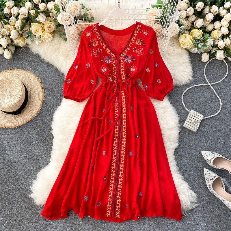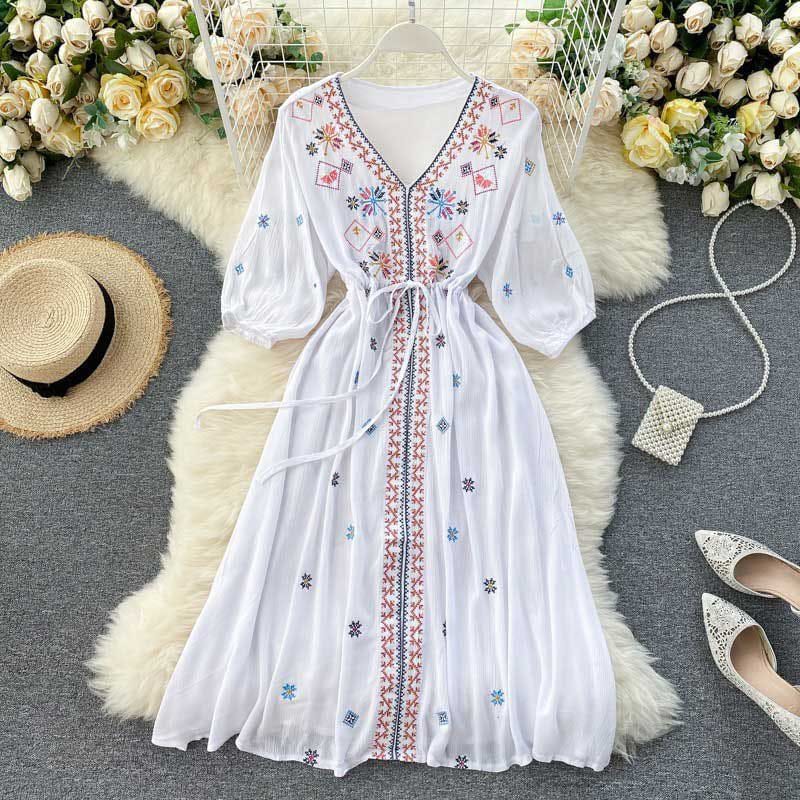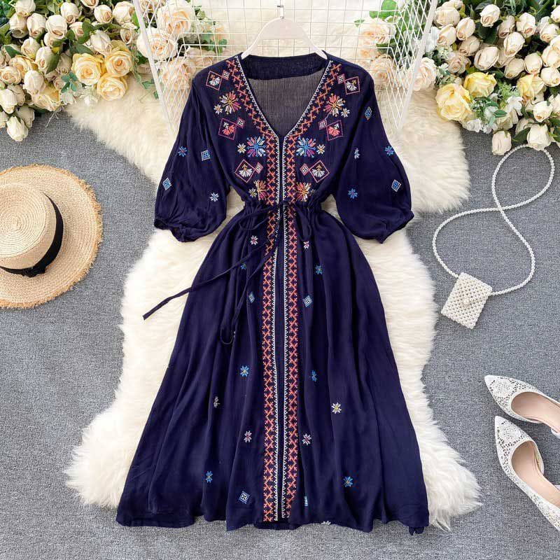 Product Details:- A very cute summer friendly frock for summers with beautiful embroidery all over neck, sleeves and flared.
